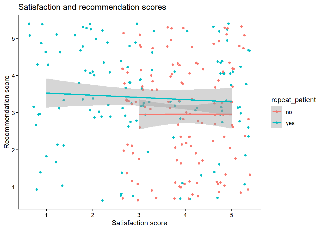summarise(), calculate the mean score for each participant for both satisfaction and recommendation. Do this for both versions of the dataset so that you can see how the structure of the dataset changes the approach you need to take.Replicate the following scatterplot showing the relationship between satisfaction and recommendation scores, by whether the patient is a repeat patient.