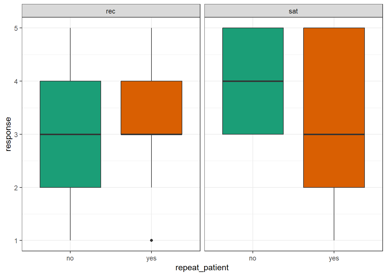 - Replicate the following boxplots showing satisfaction and recommends scores for new and repeat patients separately.