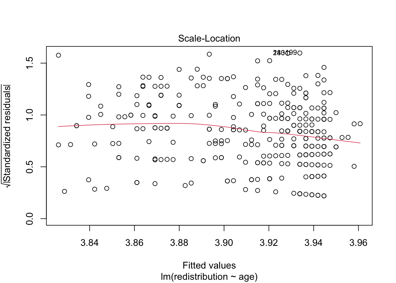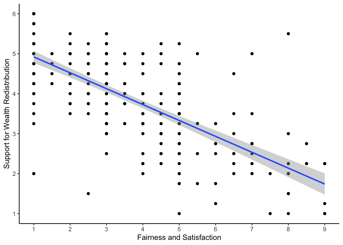“Our research question was: is there a relationship between support for wealth redistribution and fairness and satisfaction with the current system? To test this, we applied simple linear regression using fairness and satisfaction as a predictor and support for wealth redistribution as our outcome. Figure 1 shows a scatterplot of the relationship.
