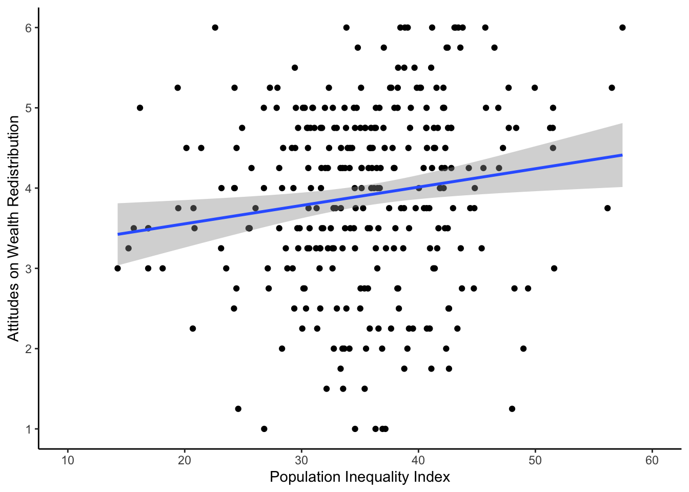 They predicted people with higher incomes have social circles with higher incomes, so they are more satisfied with the current system of wealth redistribution and less interested in changing it. In essence, poorer people and richer people have different experiences of how rich and equal their country is. In this chapter, we will explore the relationship between a range of these variables.