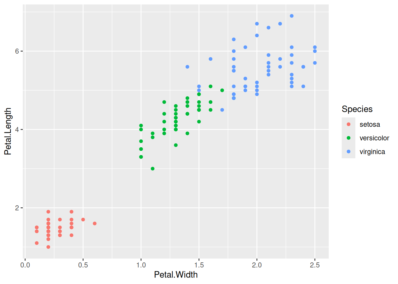 library("tidyverse")ggplot(iris,aes(x = Petal.Width, y = Petal.Length, colour = Species)) +geom_point()