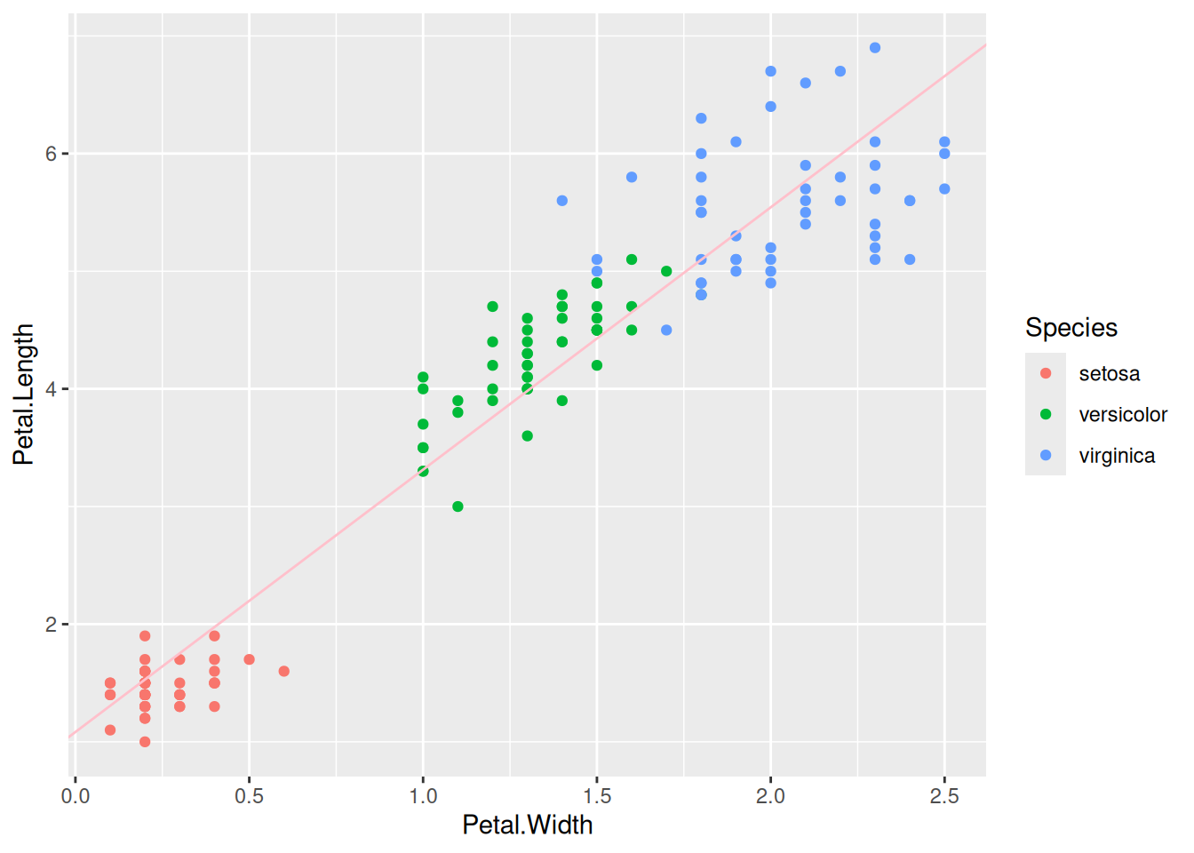 Let’s return to the iris data. Say we want to predict Petal.Length from Petal.Width. Before proceeding, it is a good idea to make a scatterplot of the data using ggplot2. We can use the colour aesthetic to capture what species a datapoint belongs to.