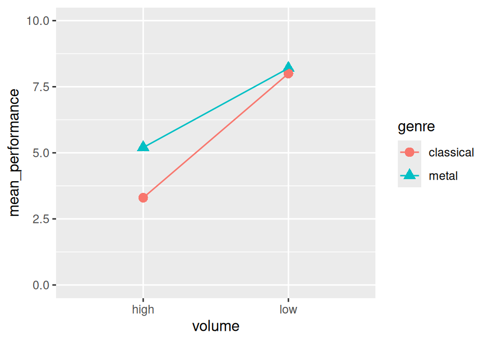 Here is some made up data looking at people’s performance on a cognitive task while listening to music at a low or high volume.