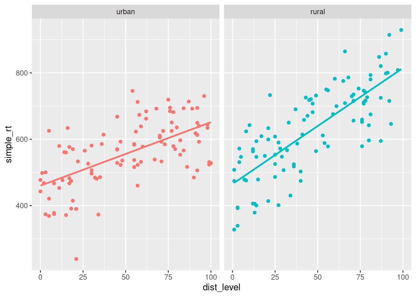 Let’s consider a simple fictional example. Say you are interested in the effects of sonic distraction on cognitive performance. Each participant in your study is randomly assigned to receive a particular amount of sonic distraction while they perform a simple reaction time task (respond as quickly as possible to a flashing light). You have a technique that allows you to automatically generate different levels of background noise (e.g., frequency and amplitude of city sounds, such as sirens, jackhammers, people yelling, glass breaking, etc.). Each participant performs the task for a randomly chosen level of distraction (0 to 100). Your hypothesis is that urban living makes people’s task performance more immune to sonic distraction. You want to compare the relationship between distraction and performance for city dwellers to the relationship for people from quieter rural environments.