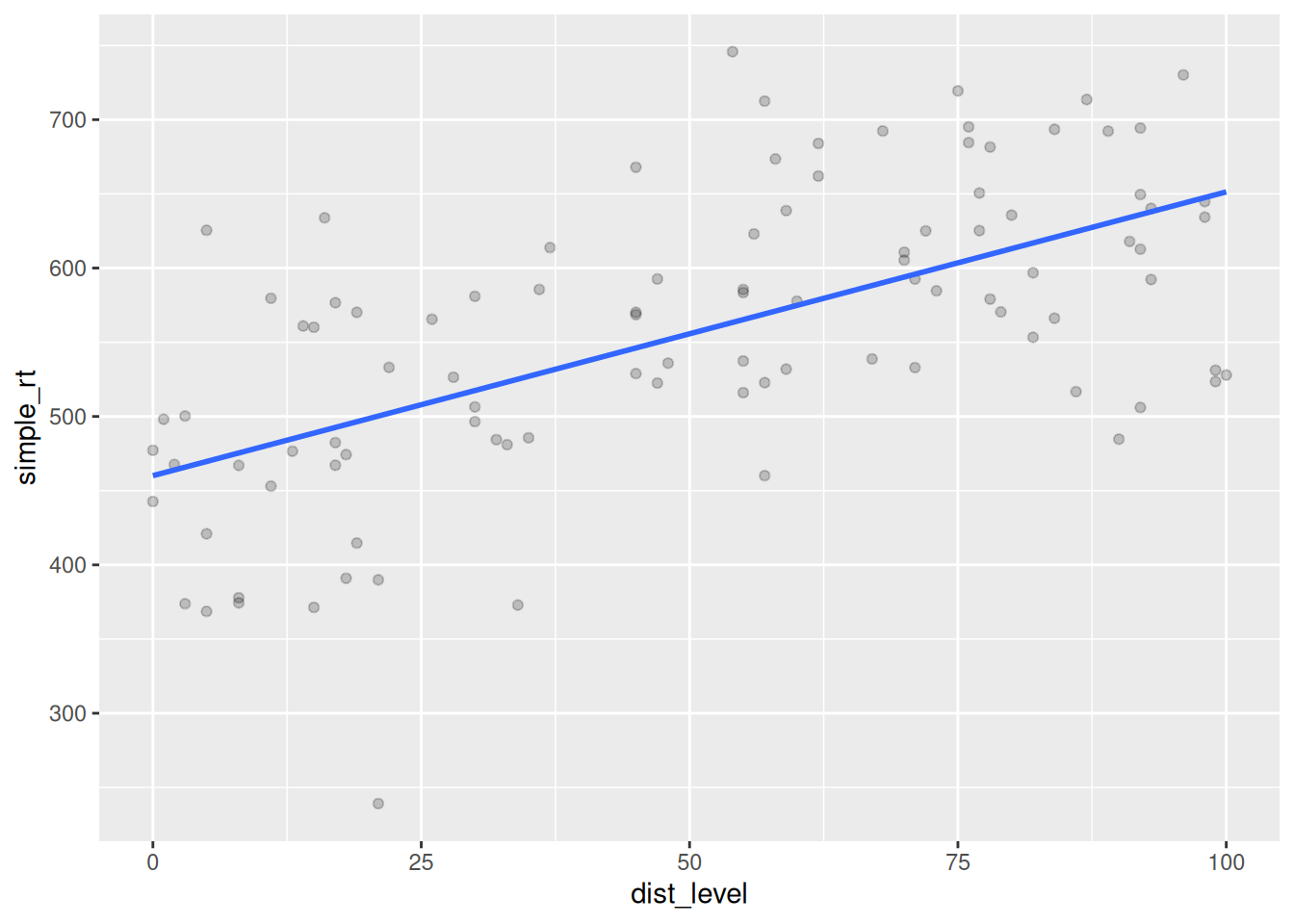 ggplot(urban, aes(dist_level, simple_rt)) +geom_point(alpha = .2) +geom_smooth(method ="lm", se =FALSE)