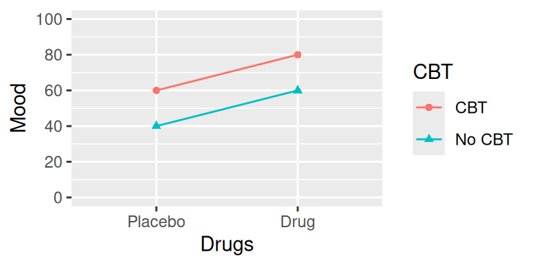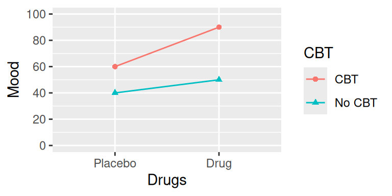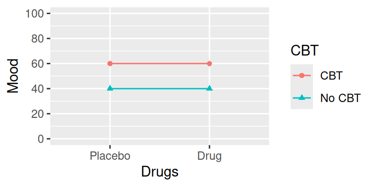 Imagine you’ve running a study looking at effects of two different types of therapy for depressed patients, cognitive therapy and drug therapy. Half of the participants are randomly assigned to receive Cognitive Behavioral Therapy (CBT) and the other half get some other kind of control activity. Also, you further divide your patients through random assignment into a drug therapy group, whose members receive anti-depressants, and an control group, whose members receive a placebo. After treatment (or control/placebo), you measure their mood on a scale, with higher numbers corresponding to a more positive mood.